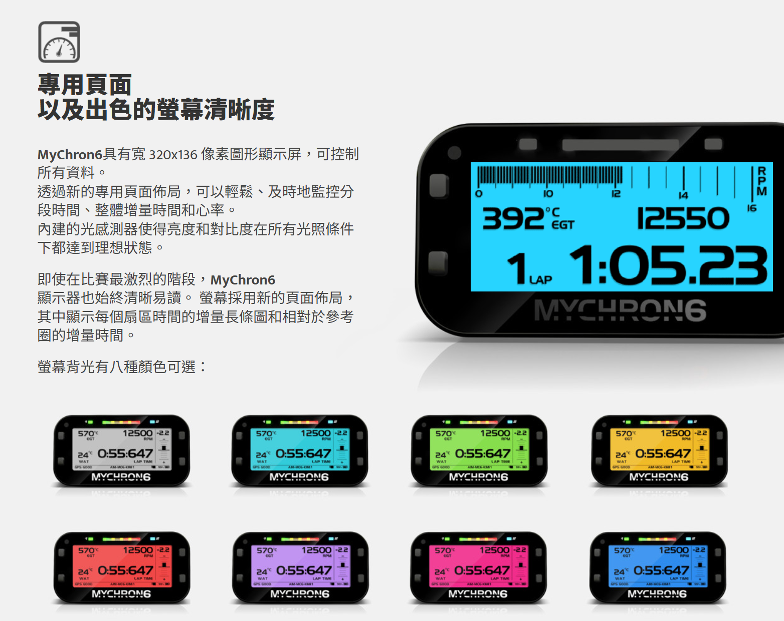內建的光感測器使得亮度和對比度在所有光照條件下都達到理想狀態。即使在比賽最激烈的階段,MyChron6