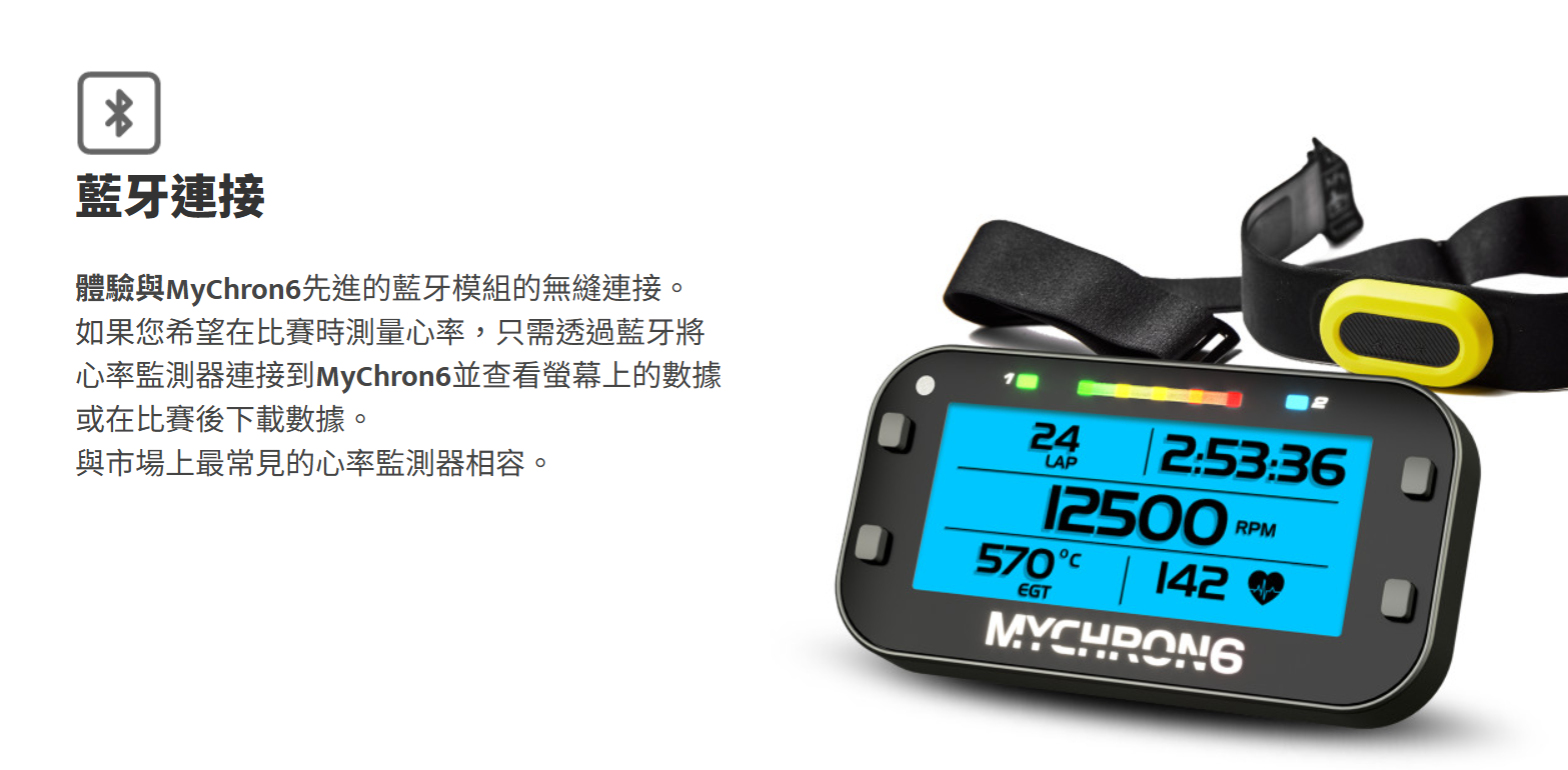 如果您希望在比賽時測量心率,只需透過藍牙將心率監測器連接到MyChron6並查看螢幕上的數據或在比賽後下載數據。