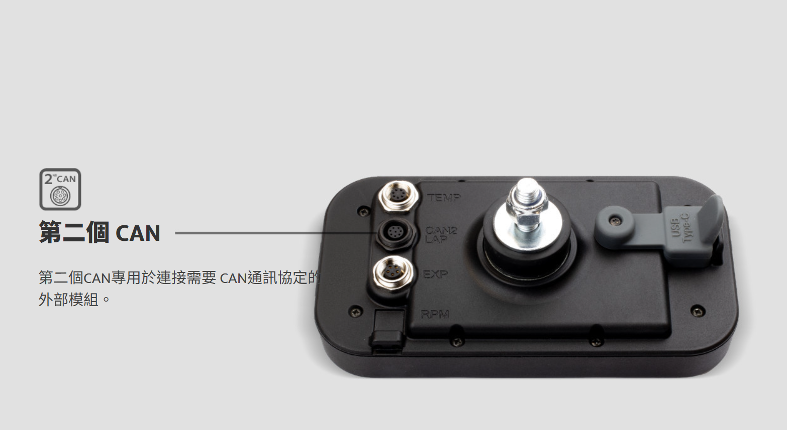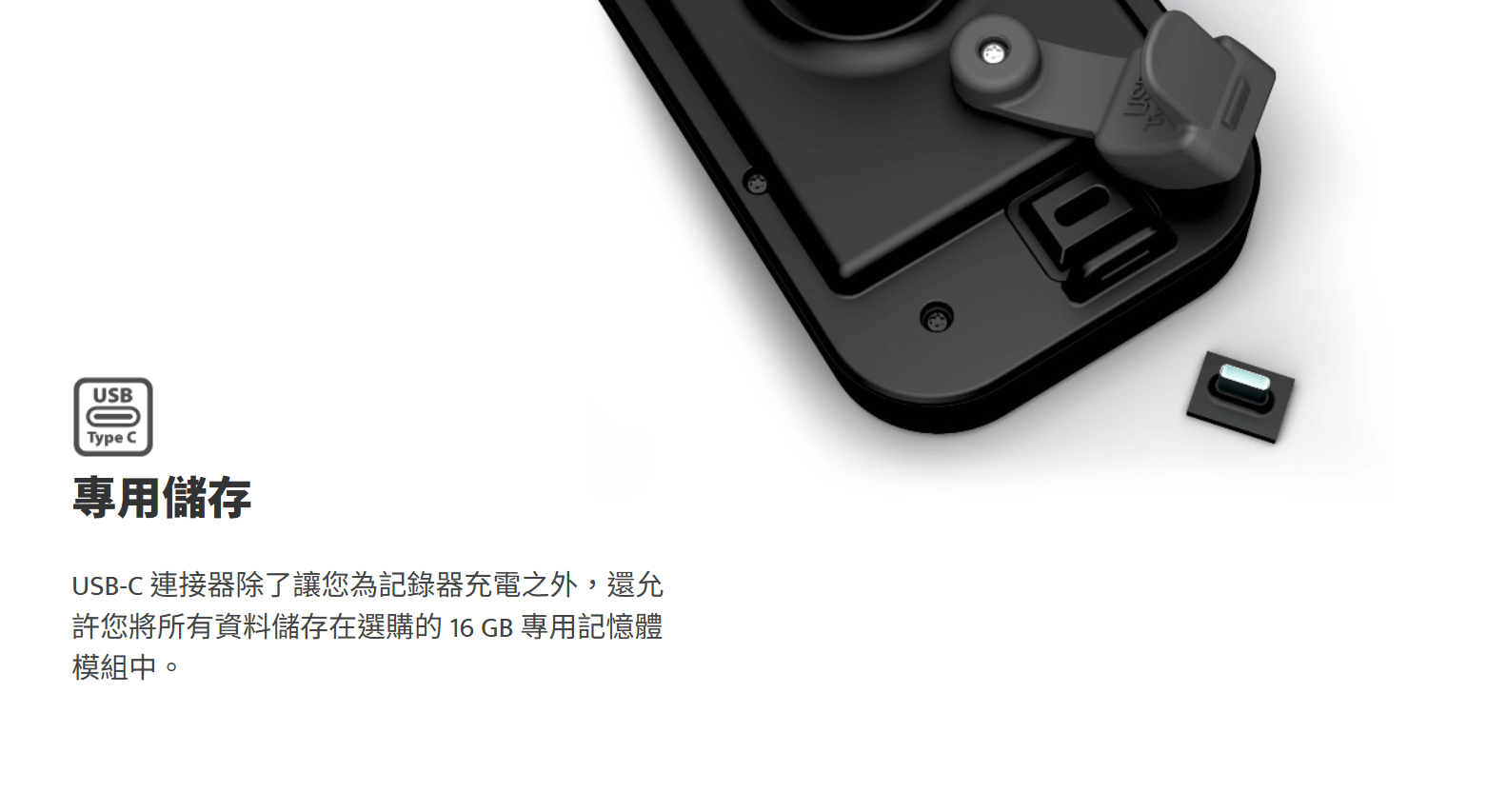 USB-C 連接器除了讓您為記錄器充電之外,還允許您將所有資料儲存在選購的 16 GB 專用記憶體模組中。