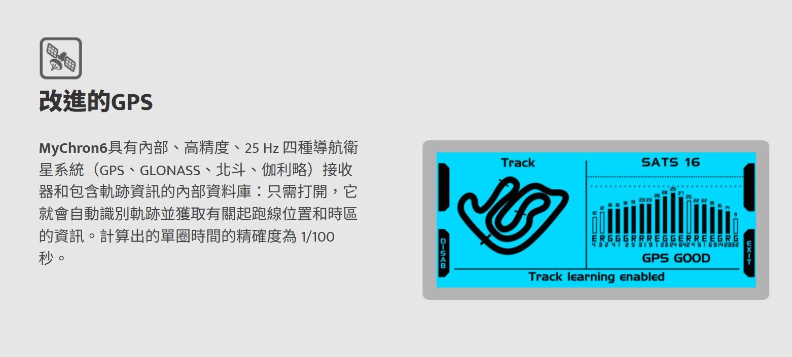 MyChron6具有內部、高精度、25 Hz 四種導航衛星系統(GPS、GLONASS、北斗、伽利略)
