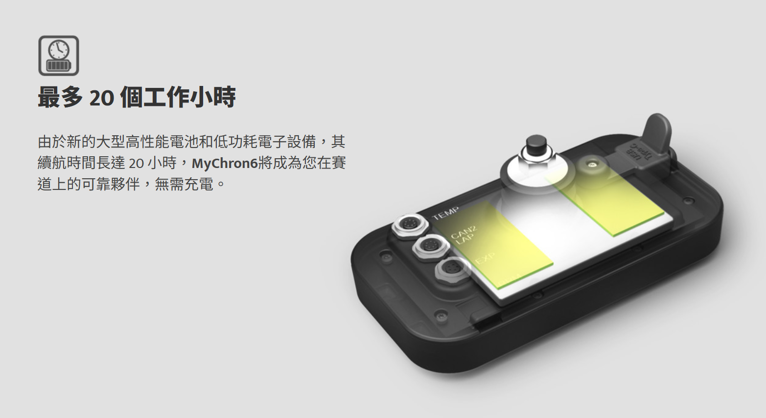 由於新的大型高性能電池和低功耗電子設備,其續航時間長達 20 小時,MyChron6將成為您在賽道上的可靠夥伴,無需充電。