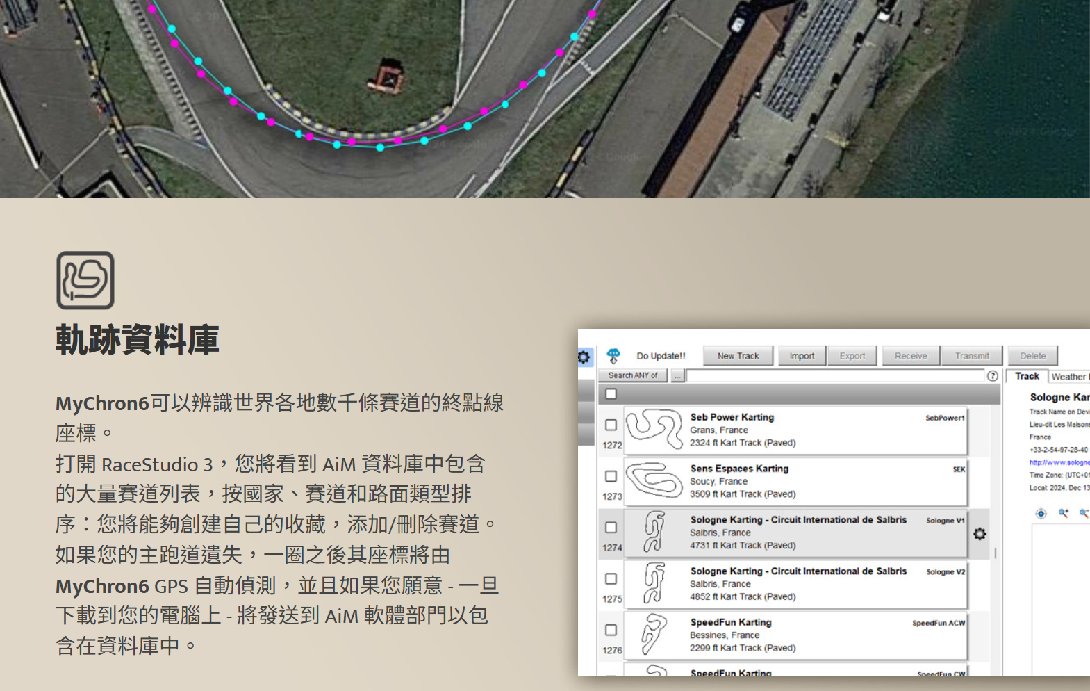 打開 RaceStudio 3,您將看到 AiM 資料庫中包含的大量賽道列表,按國家、賽道和路面類型排序: